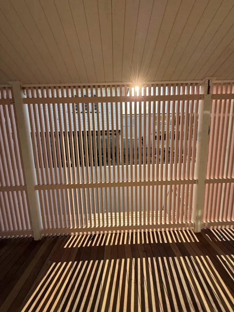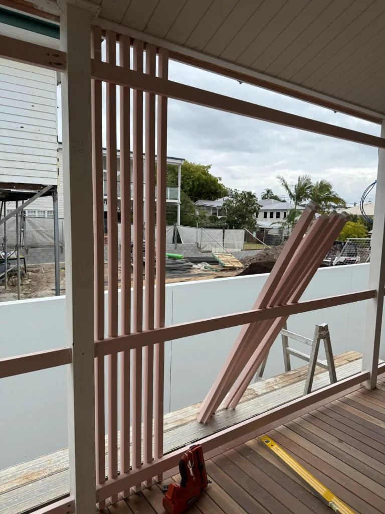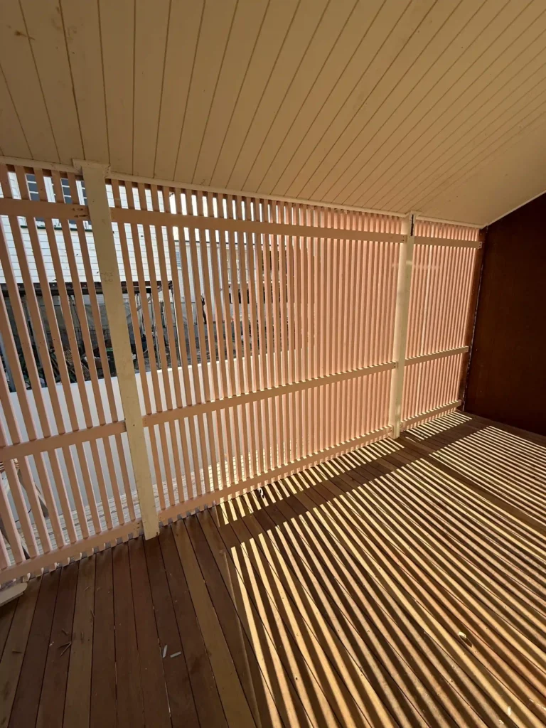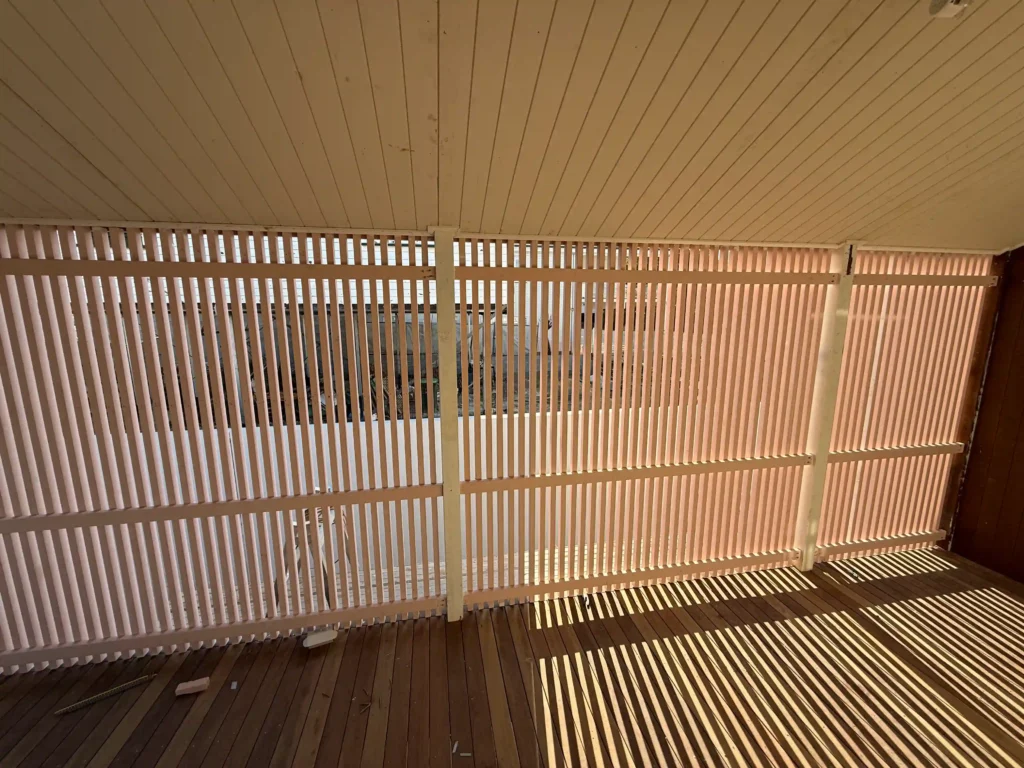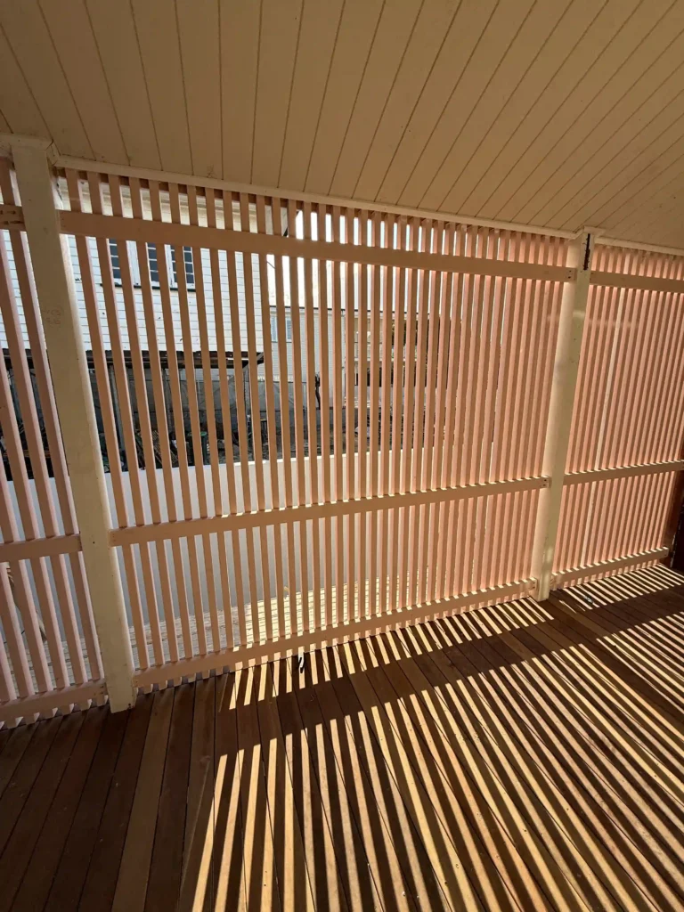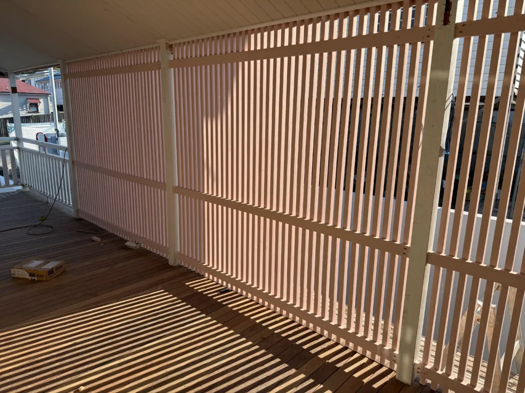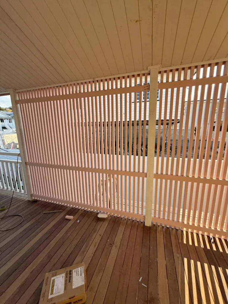 Professional deck enclosure using quality timber battens, creating privacy and wind protection while maintaining the outdoor living experience and architectural appeal.