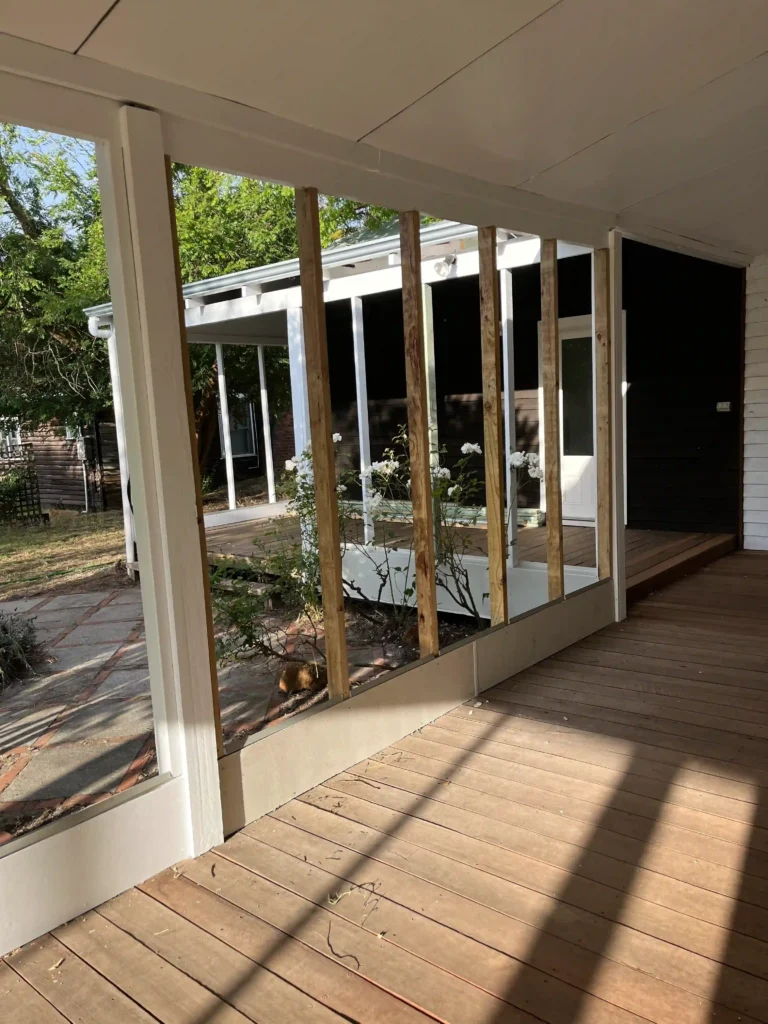 Professional deck enclosure using quality timber battens, creating privacy and wind protection while maintaining the outdoor living experience and architectural appeal.