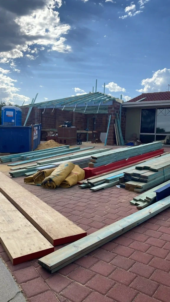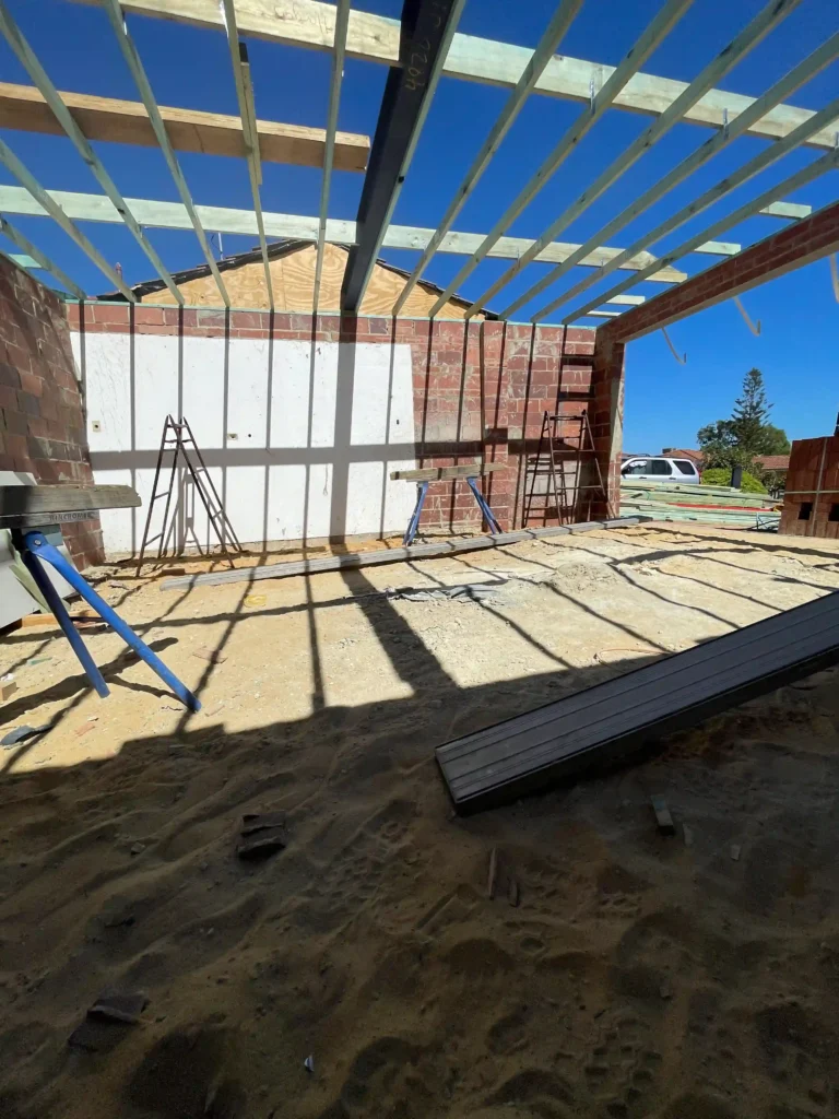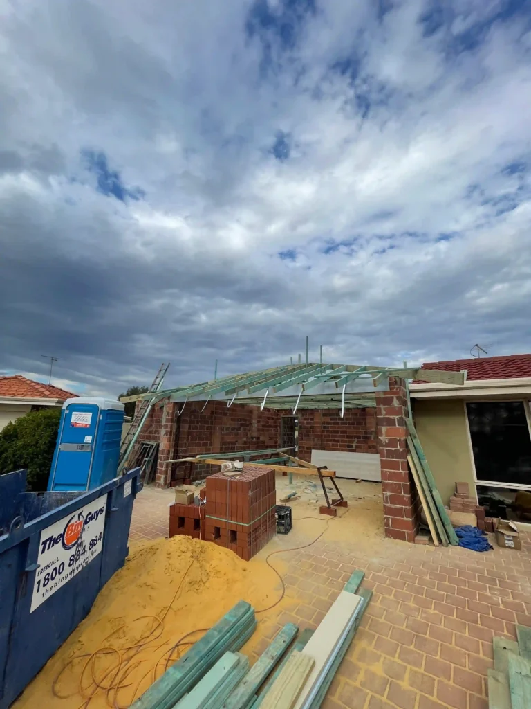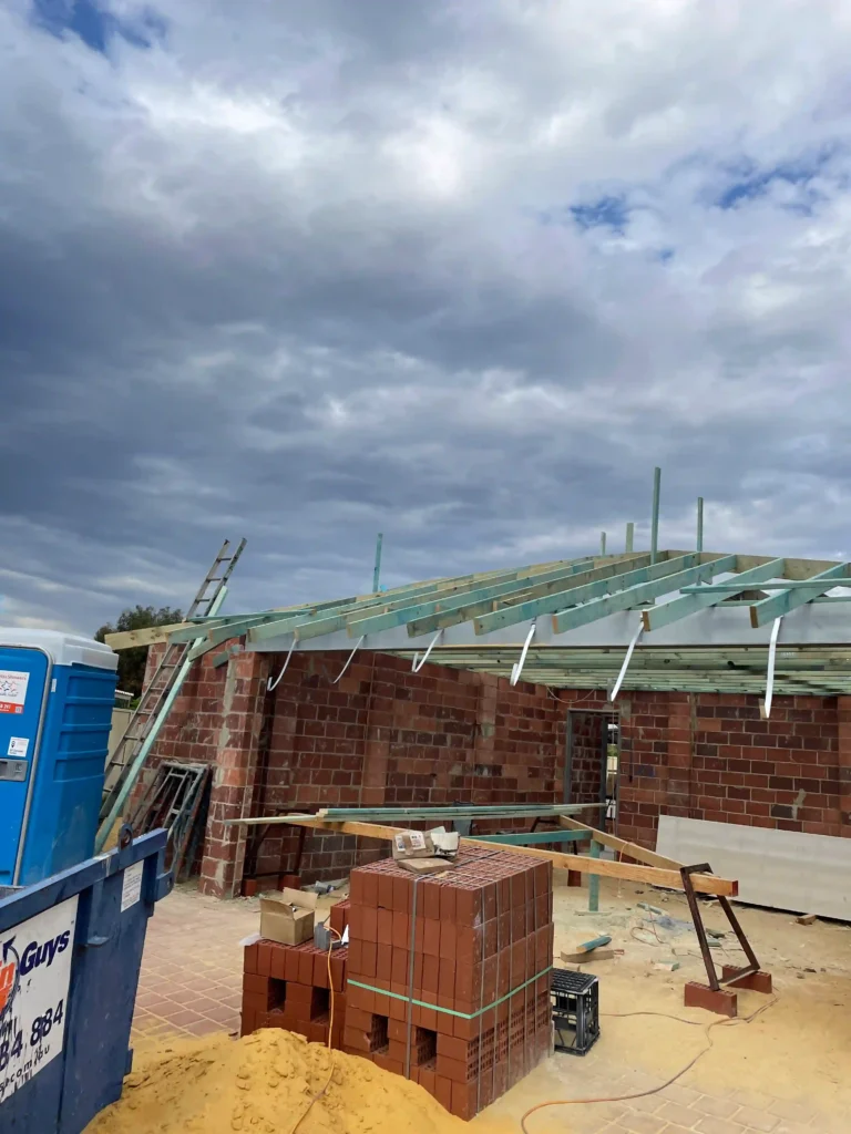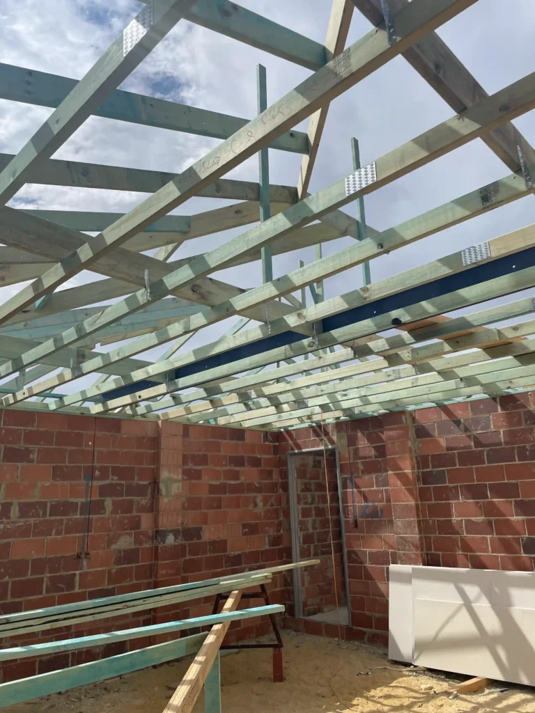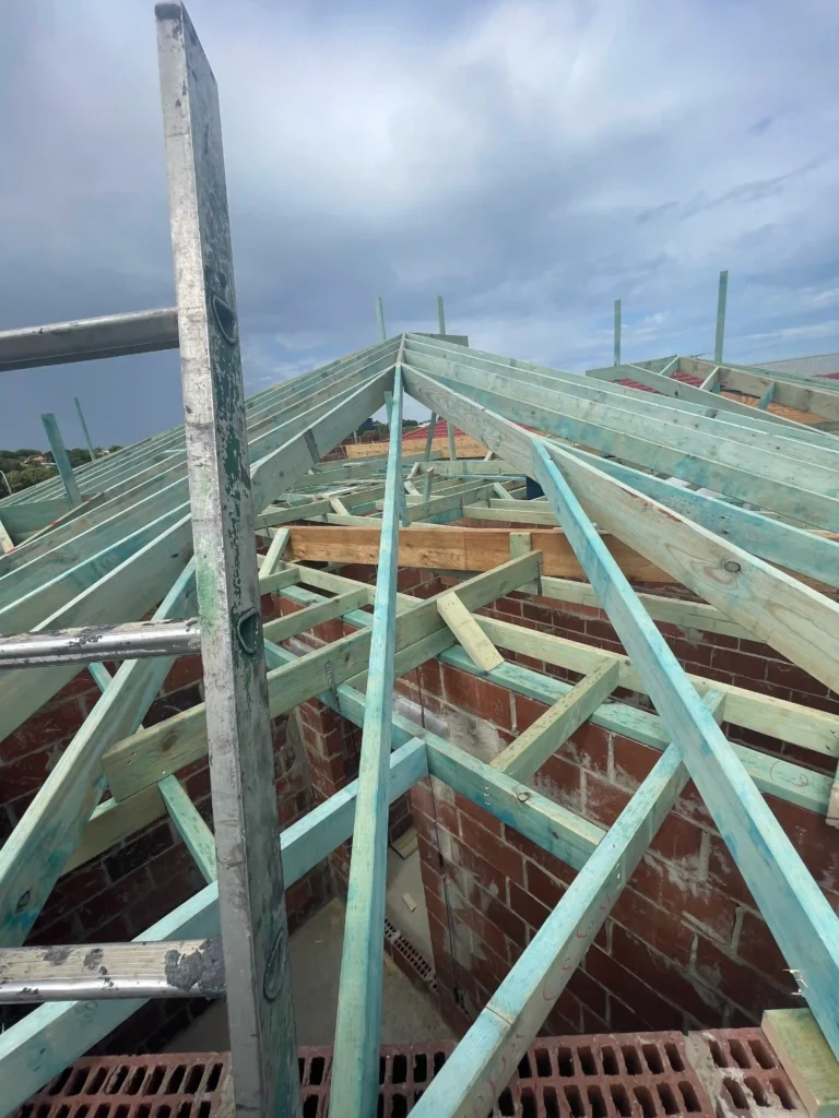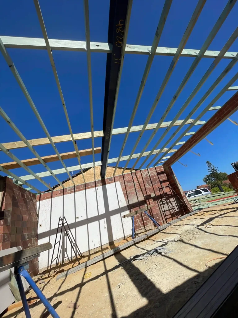 New roof construction for home extension, providing weather protection and architectural continuity with the existing structure while meeting all building standards and requirements.