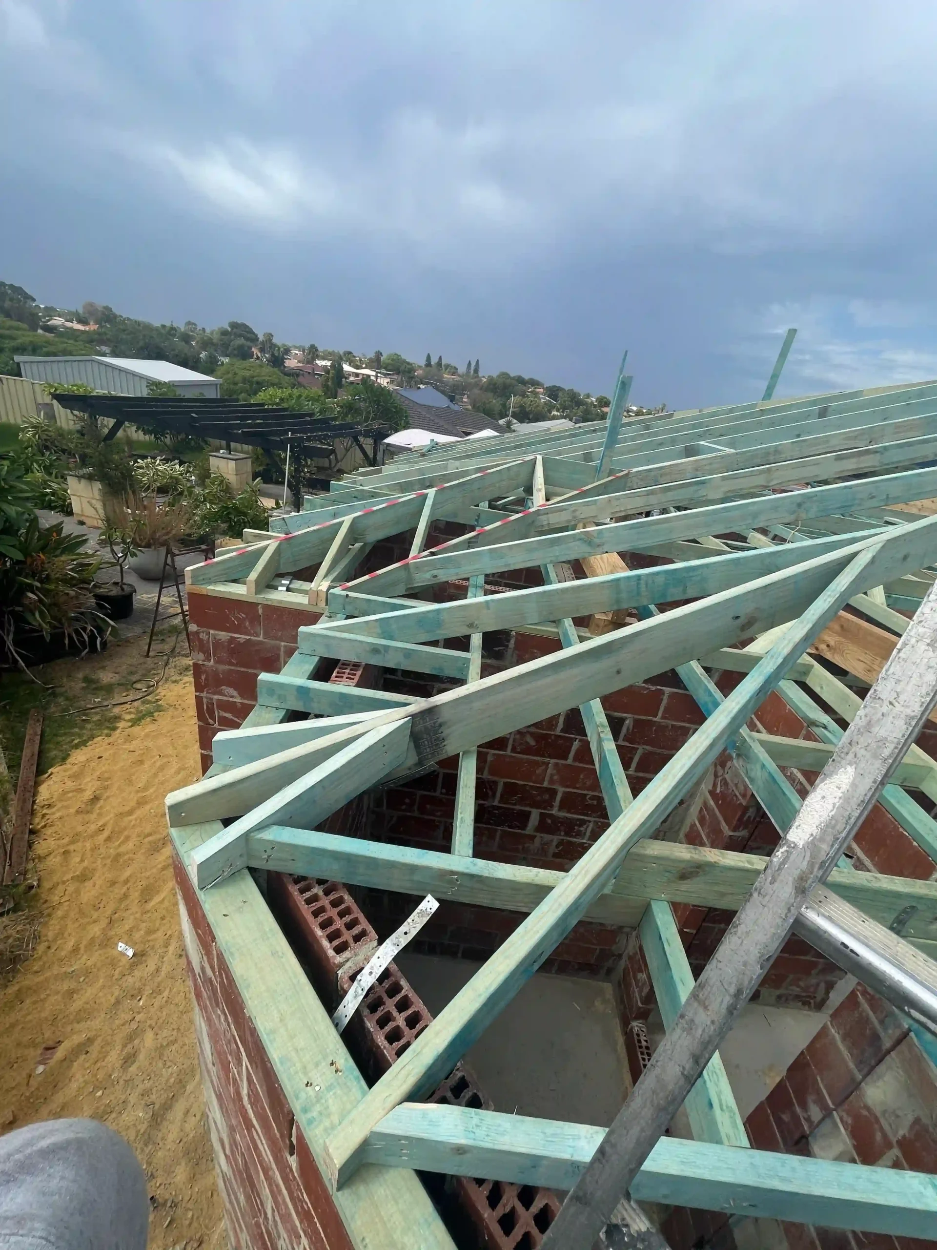 New roof construction for home extension, providing weather protection and architectural continuity with the existing structure while meeting all building standards and requirements.