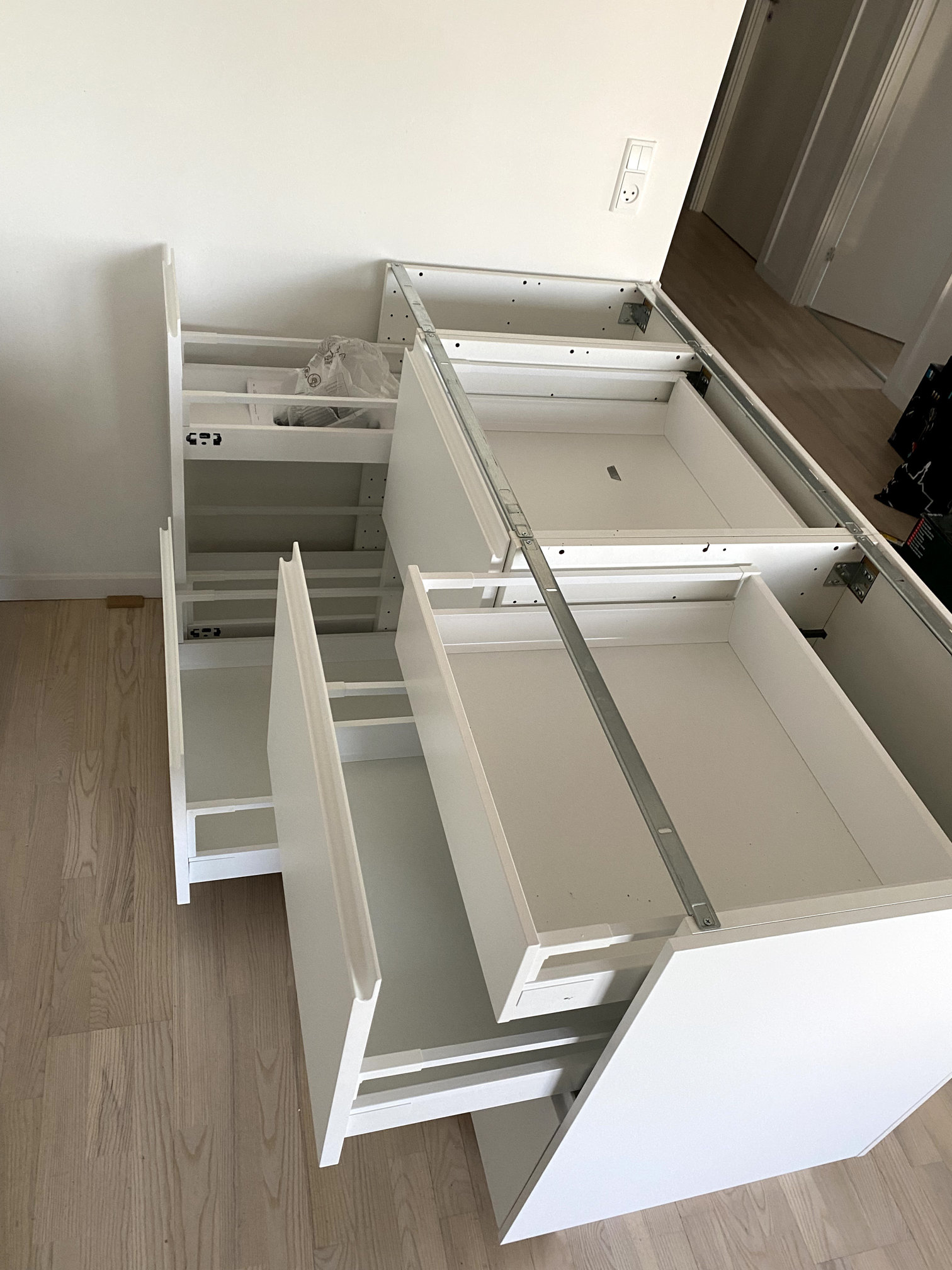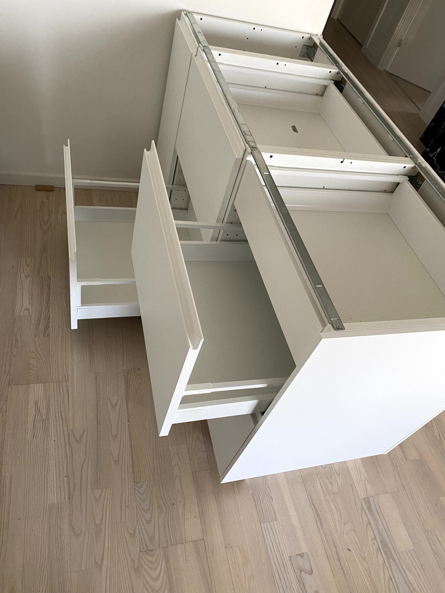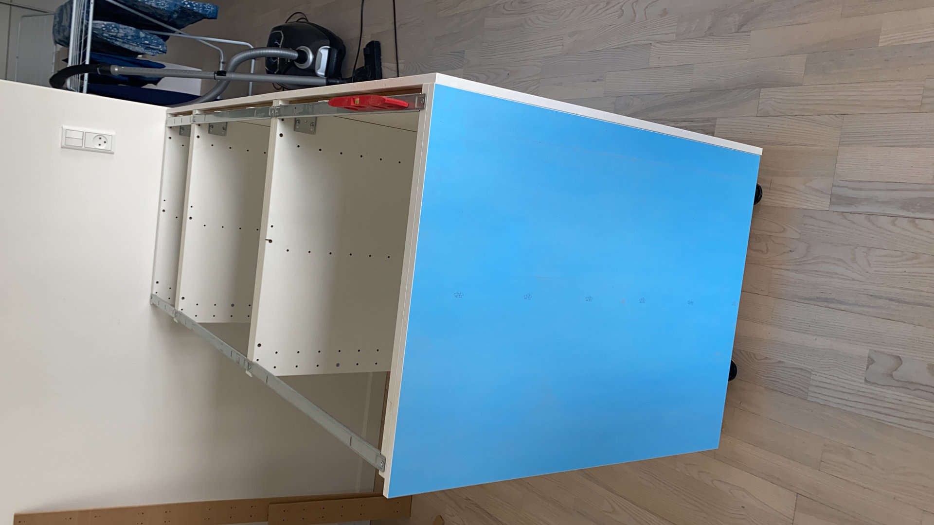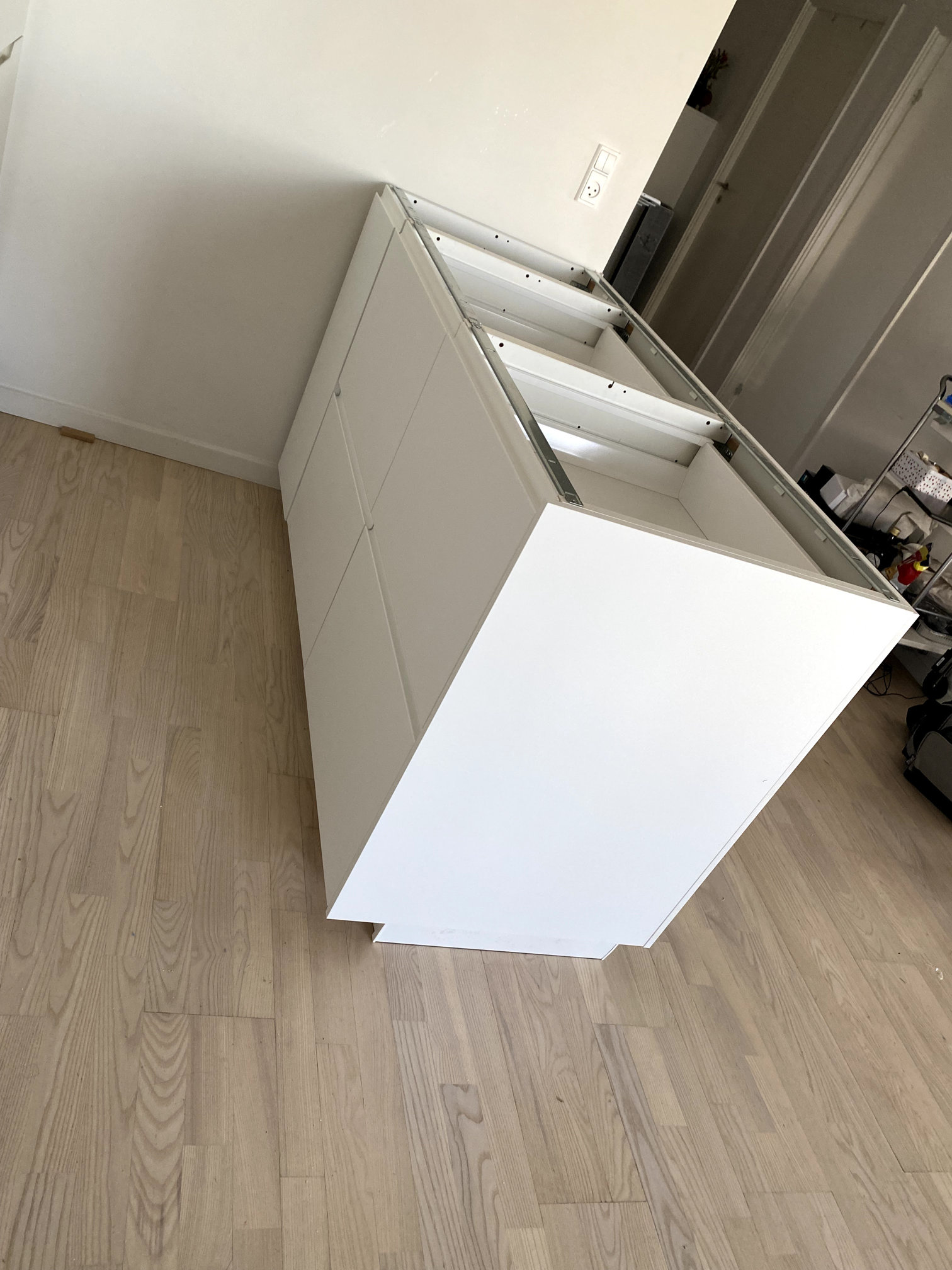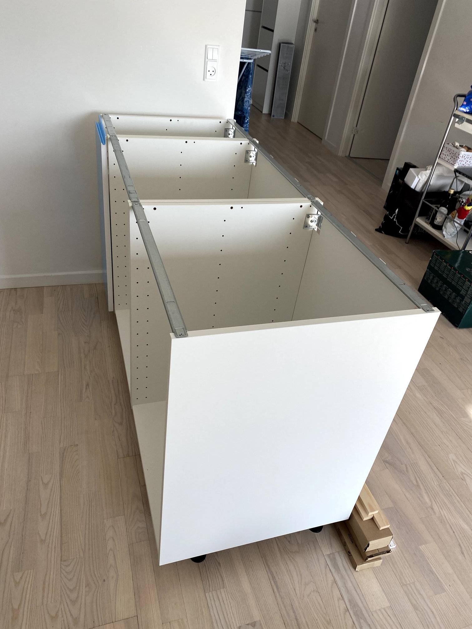 Se ensamblo e instaló cocina Ikea sobre superficie desnivelada tanto en suelo como en paredes.